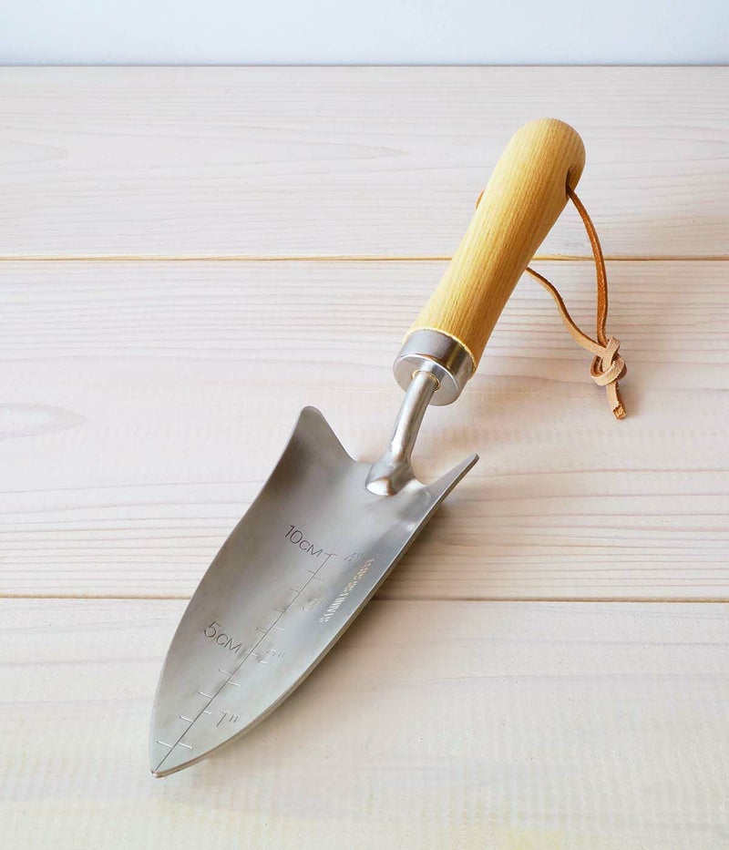 トネリコの持ちやすいウッドハンドルに革紐が付いた、シンプルで実用性の高いステンレスツール。