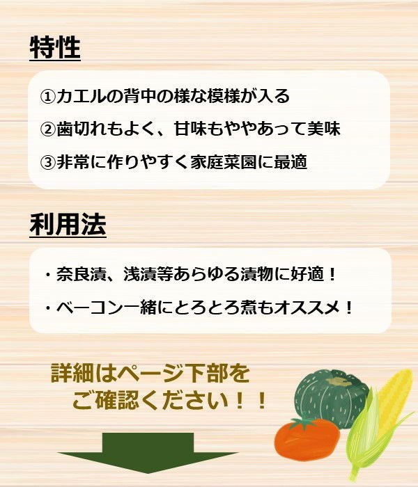・奈良漬、浅漬等あらゆる漬物に好適で、非常に作りやすく営利用はもちろん、自家用に是非栽培したい優良種です。