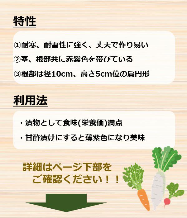 特に寒地の方面では人気が高く、葉は濃緑色を帯び、茎・根部共に赤紫色を帯びています。根部は径10cm高さ5cm位で扁円形を呈し、皮肌の光沢抜群です。