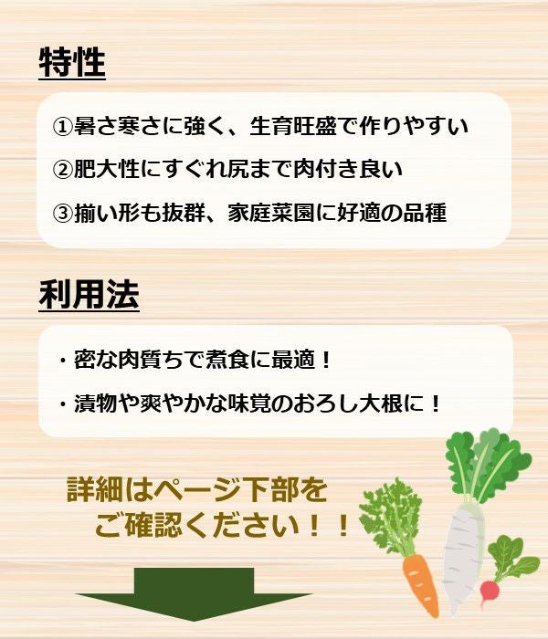 暑さ寒さに強く、生育旺盛で作りやすい大根です。
