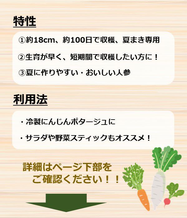 1) 約18cm、約100日で収穫、夏まき専用の早太り五寸人参です。