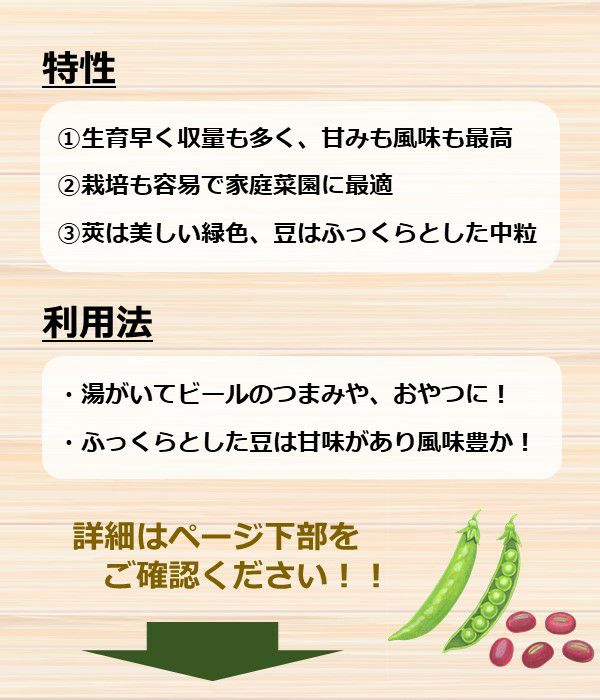 草丈50~60cm、莢は美しい緑色、豆はふっくらとした中粒で甘味、風味も最高、真夏の食卓を彩ります。