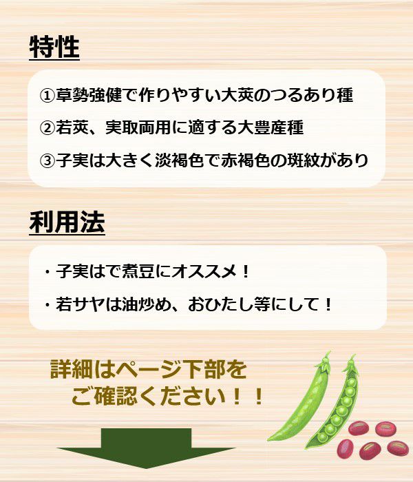 草勢強健で作りやすい大莢のつるあり種で、若莢、実取両用に適する大豊産種。