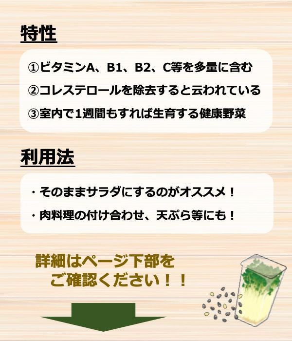発芽直後の若い葉茎をもやしとして栽培するもので、ビタミンA、B1、B2、C、E、を多量に含み、又、タンパク質も他の食品より群を抜いて多く含有した栄養野菜で、コレステロールを除去すると云われています。