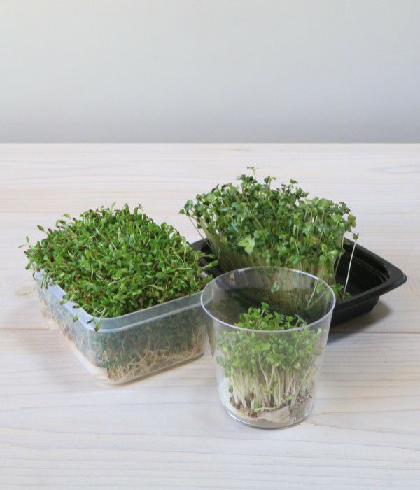 水と容器、キッチンペーパーがあれば室内で年中作ることが可能で、種まき後、5~7日で収穫が出来ます。