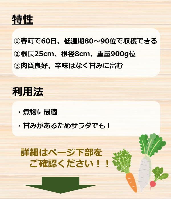 低温弱光線下でも肥大が早く、春蒔で60日低温期で80日~90日位で収穫できる。