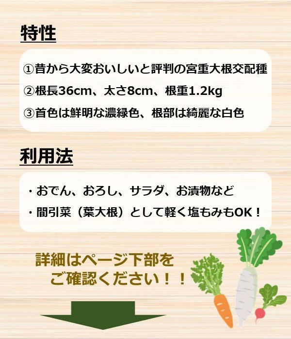 昔から大変おいしいと言われている、宮重大根の交配種、根長36cm、太さ8cm、根重1.2kg位に良く揃い、首色は鮮明な濃緑色で根部は綺麗な白色。