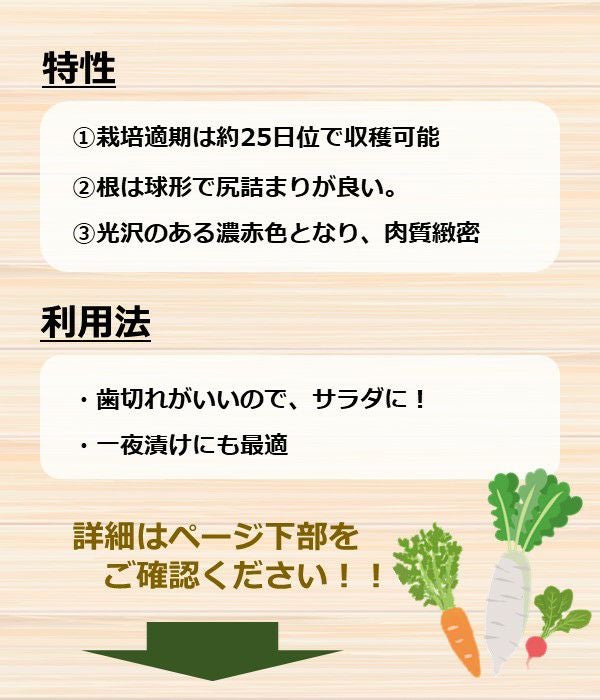 根の肥大が早く、栽培適期で約25日位で収穫ができる。