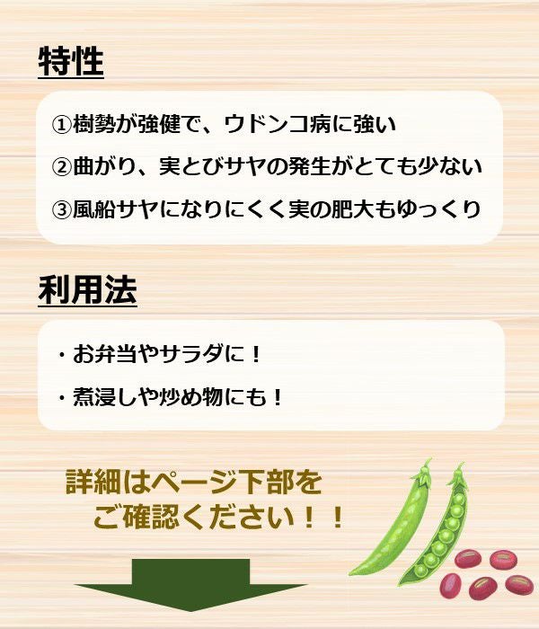 樹勢が強健で、ウドンコ病に強い絹つるなしのさやえんどうです。