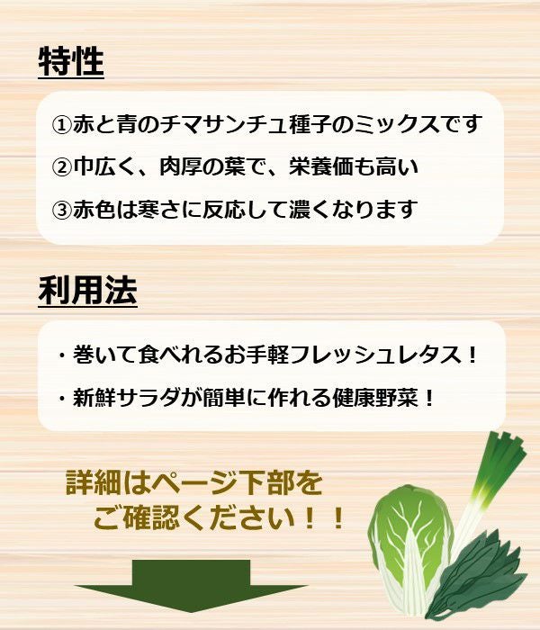 他の画像を見る 固定種 オリジナル コート種子だからまきやすい! アサヒ育成 チマサンチュ赤・青ミックス(リーフレタスの種)(コート種子) 当店特別価格 ¥ 385 税込 詳細を見る お気に入りに登録する