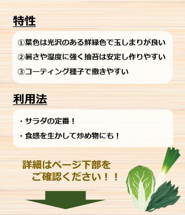 耐暑、耐湿性強く極めて強健で抽苔は安定していて作りやすいです。播種後60~65日収穫。