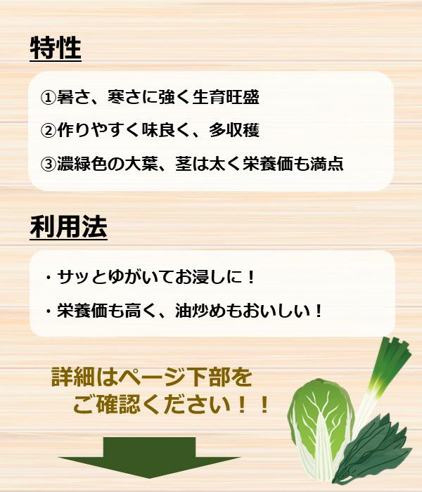 暑さ、寒さに強く生育旺盛、作りやすく味良く、多収で全国的に広く栽培されています。