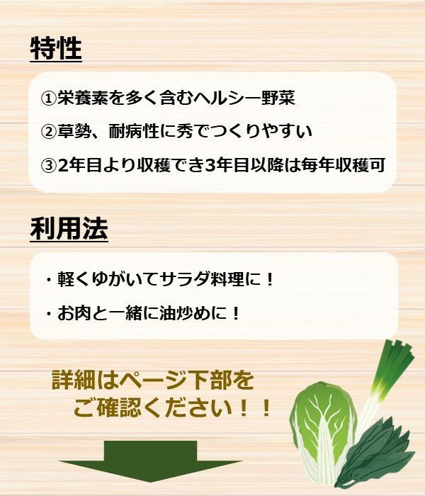 ビタミン等のスタミナ源となる栄養素を多く含んだヘルシー野菜です。草勢、耐病性に秀でつくりやすく、2年目より収穫をしますが3年目以降は毎年収穫できます。(5~10年間位)