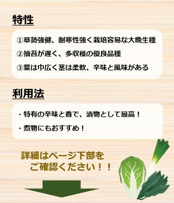 葉は濃緑色を呈し縮緬状で巾広く、茎は白色の厚肉で柔軟、辛味と風味があり漬菜として最適です。
