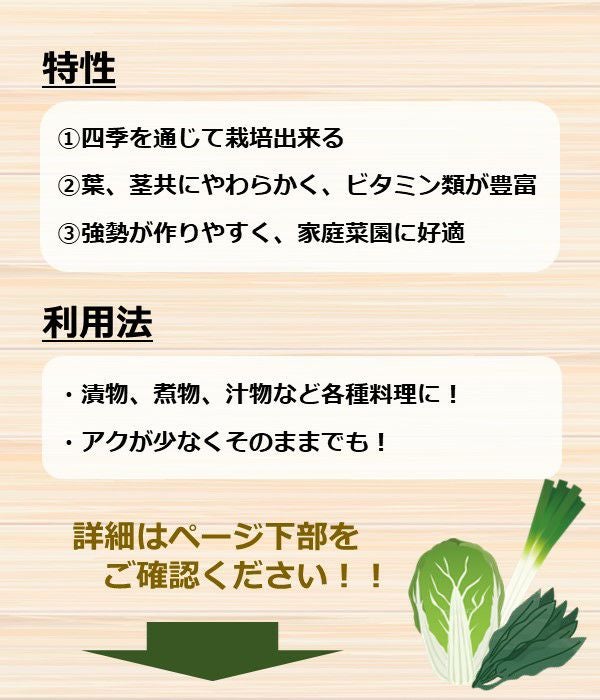 濃緑葉でやわらかい。味も良く、年中栽培可能