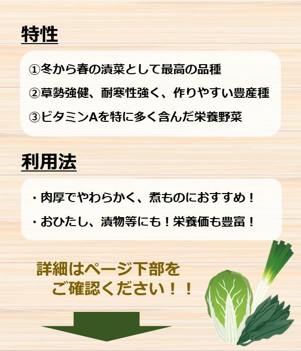 葉は濃緑、冬から春の漬菜として最高の品種です。
