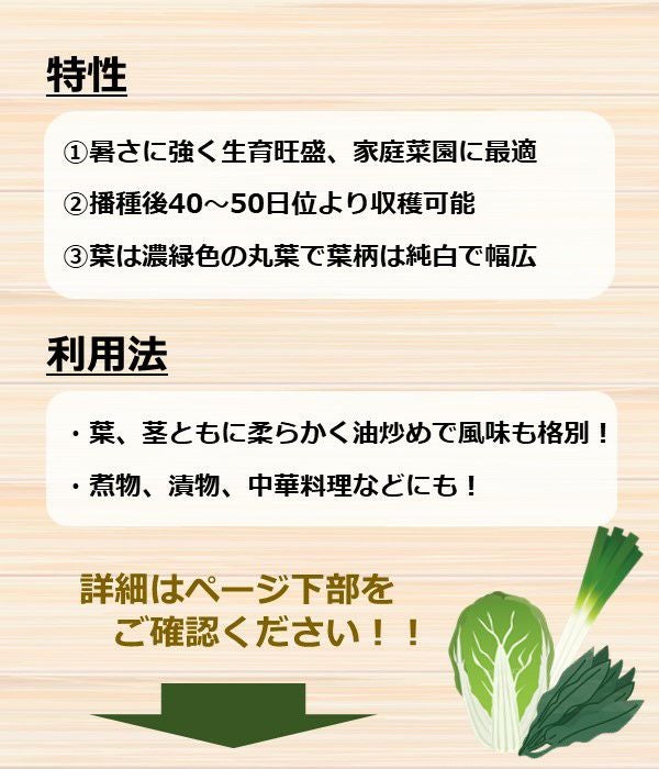 葉は濃緑色の丸葉で葉柄は純白で幅広く体菜によく似ています。作りやすく家庭菜園に最適です。