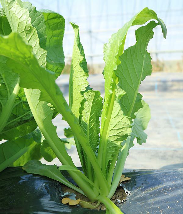 葉柄や中肋(葉の軸)が太く、歯切れの良い食感と、特有の風味があります。