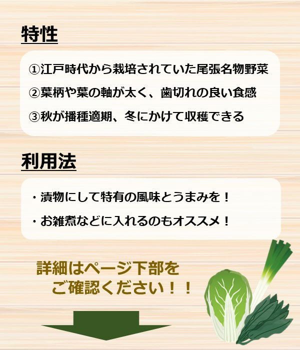 知多郡大高町(現名古屋市緑区)で、古く江戸時代から栽培されていた尾張名物の野菜の1つ。野沢菜に近い在来種の菜類です。