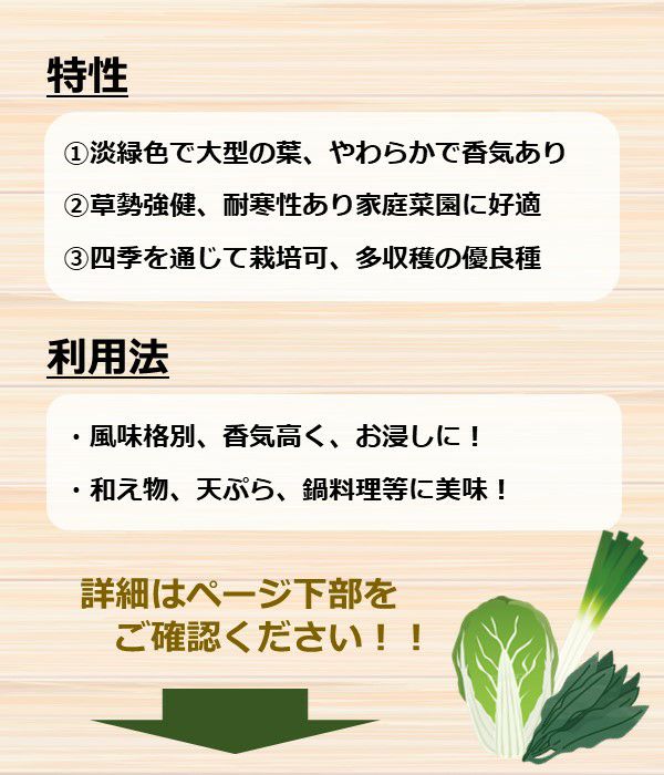 濃緑葉でやわらかい。味も良く、年中栽培可能
