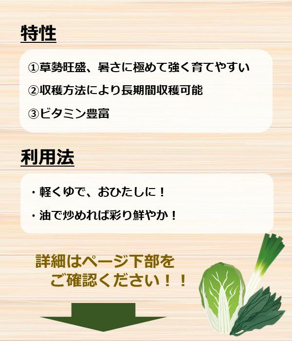 草勢旺盛、暑さに極めて強く、真夏の直射日光の下でも、よく生育します。葉は先端の柔らかいものを収穫すれば、次々とわき芽が発生し長期間収穫できます。ビタミンもいっぱい。