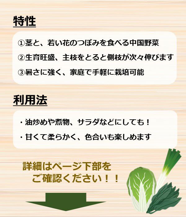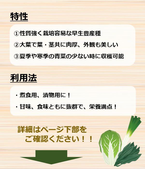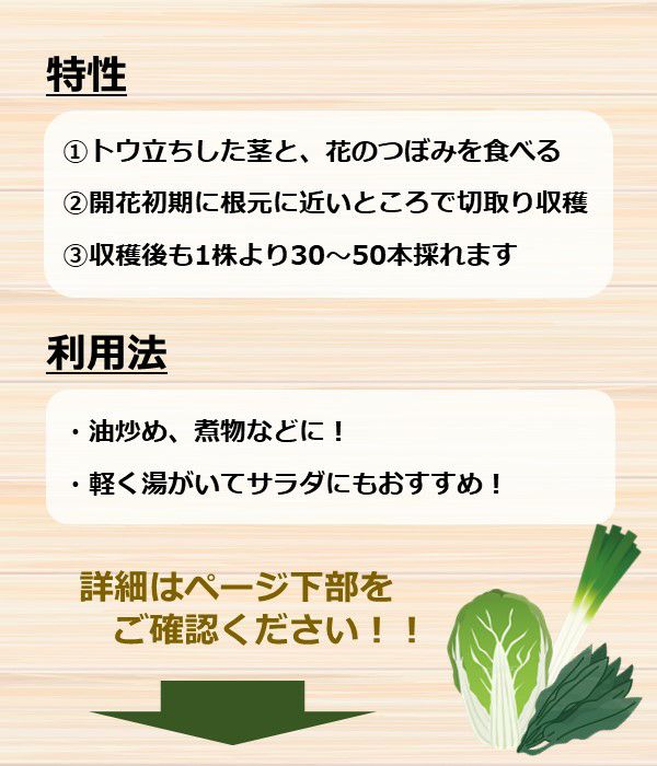 草勢強健、抽苔の遅い晩生タイプ!耐寒性があり、多収穫で栽培容易!
